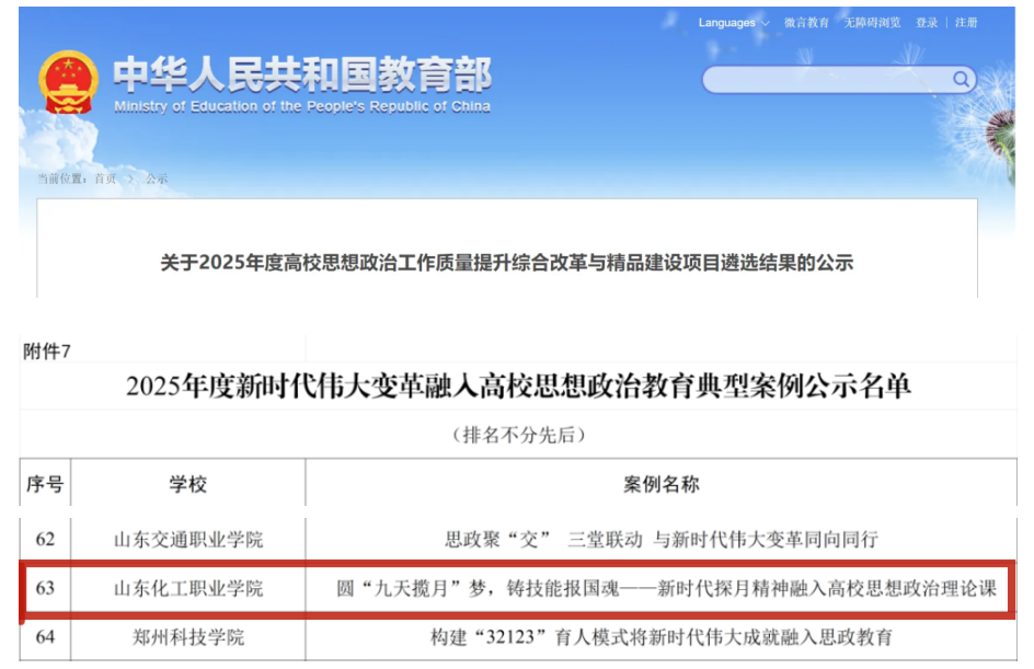 近日,教育部对2025年度高校思想政治工作质量提升综合改革与精品建设项目遴选结果进行了公示我校《“九天揽月”梦,铸技能报国魂--新时代探月精神融入高校思想政治理论课》入选教育部2025年度新时代伟大变革融高校思想政治教育典型案例,思政工作实现新突破。