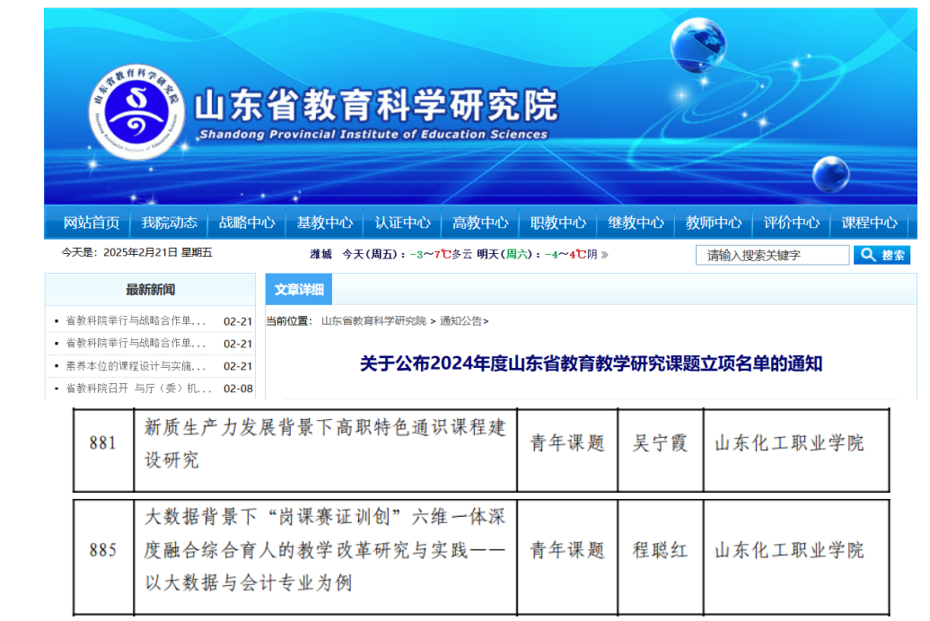近日,山东省教育科学研究院发布《关于公布2024年度山东省教育教学研究课题立项名单的通知》(鲁教科院函〔2024〕86号)。我校吴宁霞主持的《新质生产力发展背景下高职特色通识课程建设研究》和程聪红主持的《大数据背景下“岗课赛证训创”六维一体深度融合综合育人的教学改革研究与实践——以大数据与会计专业为例》获批青年课题立项,标志着我校在教育教学研究领域取得了新的重要进展。