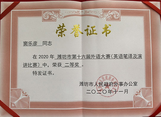 1026日接到参赛通知时,距离比赛日已经不到十天。尽管平时还有繁重的教学任务,但窦老师还是在短时间内根据比赛要求做了精心准备,最终凭借扎实的基本功和过硬的业务素质,以总分第四名荣获二等奖,并成功入选潍坊市翻译人才库。