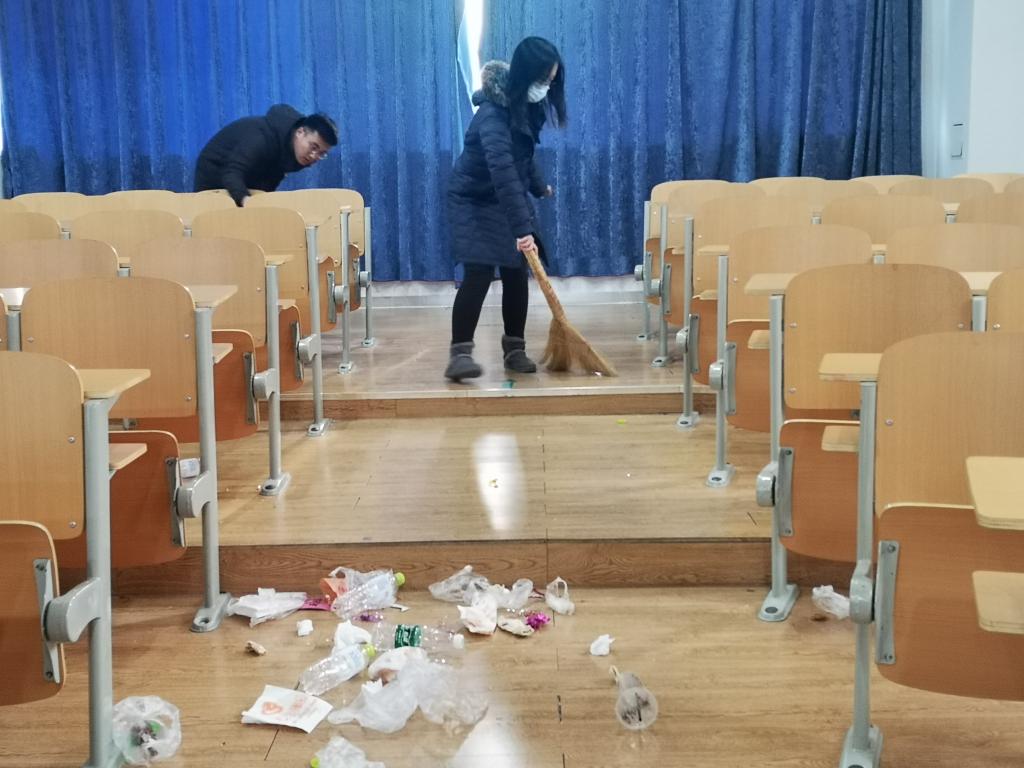中午12点半,基础教学部党员和入党积极分子到达现场,针对阶梯教室的角落、桌面、桌洞、缝隙、地面等较为隐蔽、不易清理、影响环境的地方进行了清扫。经过近半个小时的共同努力,教室内的卫生环境得到了良好改善。