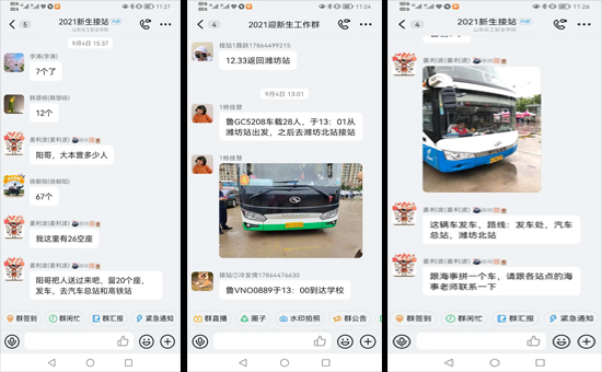 七点刚过,徐朝阳、王佃庆和李涛三位老师已经在火车站、停车场和汽车总站就位。志愿者还在路上,老师们先做些前期的准备。火车站这边已经聚集了许多新生和家长,徐老师第一时间联系了司机师傅,七点半的时候两辆大客已经驶上了返校的路途。