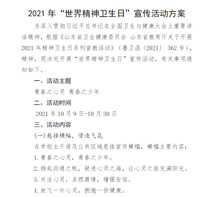 10月10日是世界精神卫生日,为深入贯彻习近平总书记在全国卫生与健康大会上重要讲话精神,根据《山东省卫生健康委员会 山东省教育厅关于开展 2021 年精神卫生日系列宣教活动》(鲁卫函〔2021〕362 号),普及心理健康知识,提高大学生对精神疾病的科学认识,推动形成理解、接纳、关爱心理问题同学的校园氛围,我校特组织开展山东化工职业学院世界精神卫生日系列活动。