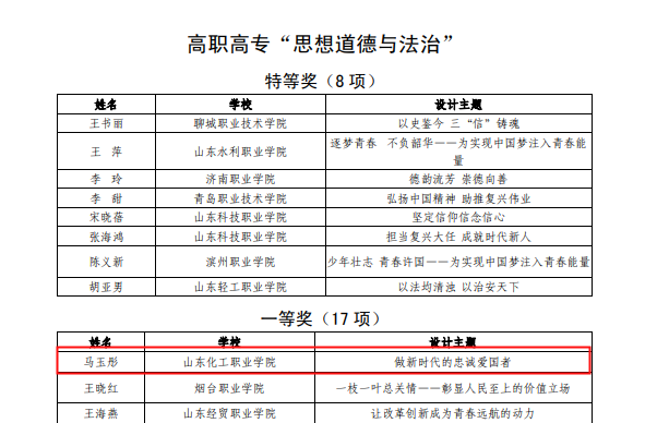 近日,根据山东省教育厅《关于公布首届全省学校思政课教学设计大赛结果的通知》,我院马玉彤老师《做新时代的忠诚爱国者》获得高职高专组“思想道德与法治”一等奖,齐甜甜老师《做文化自信人 筑文化强国梦》获得高职高专组“毛泽东思想和中国特色社会主义理论体系概论”二等奖。实现了我校教师在省级教育教学技能赛项中的新突破。