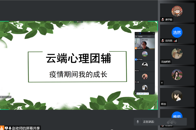 学校云端心理团辅已经持续开展两个周,近千名同学积极参与互动。心理团辅活动帮助同学们及时调整心态,坚定抗疫胜利的信心,取得了很好的成效。3月30日下午我校继续通过腾讯会议形式举行第三期团辅活动-疫情期间我的成长。