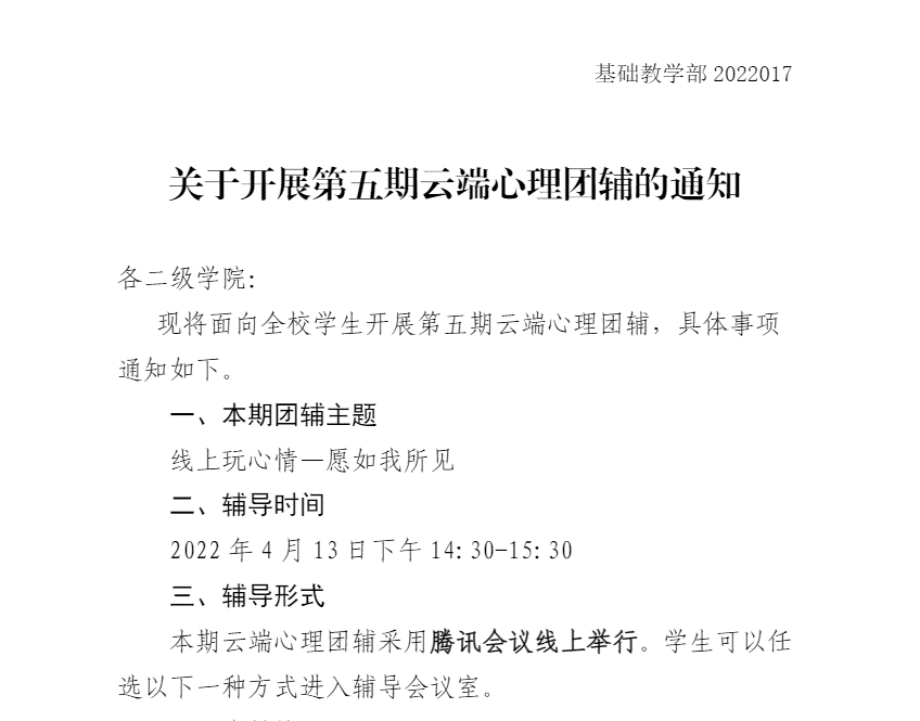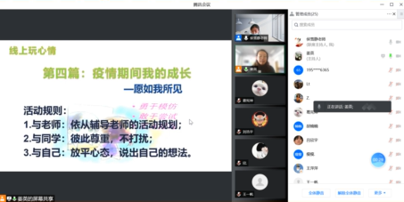 自疫情发生以来,学校通过开展云端团辅,针对疫情期间同学们可能出现的心理困扰,有针对性的为大家提供心理疏导,通过“说说我们的烦心事”“疫情结束后我最想做的事”“疫情期间我的成长”“人际关系沟通技巧”“线上‘玩’心情,如我所愿”五次团体辅导,有效疏导了同学们的心理压力,也共同见证了同学们的成长。
