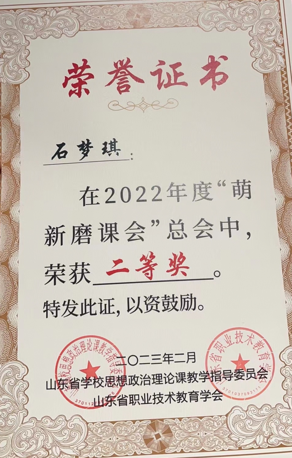 2月25日至26日,山东高校思想政治理论课2022年度“萌新磨课总会”在泰安举办,经过评委打分、专家点评,我校马克思主义学院思政课专任教师石梦琪获得二等奖,实现了我校在该项活动中的成绩突破。