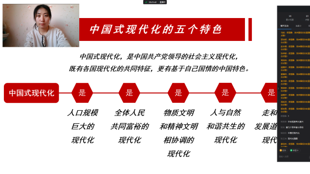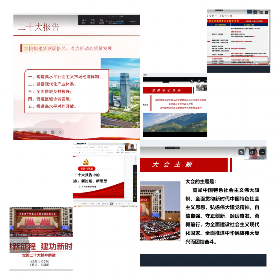 马克思主义学院认真落实思政育人功能,以线上课堂、讲座的形式,让党的二十大精神“热气腾腾”地走进课堂,有机融入到形势与政策课程和师生互动交流中。思政教师引领学生深学、细悟、“数记”、图说、云分享。深学,即组织学生原原本本学报告,逐字逐句悟思想;细悟,人人谈体会,人人讲心得,并以作业的形式上报对二十大精神的深刻领悟;数记,通过二十大报告“数字”化来强化记忆、通过“数据”增进理解;图说,发动学生将心得体会绘于纸面,用亮丽色彩绘就新征程,用青春画笔书写强国梦;云分享,即教师在线讲解二十大报告中的新思想、新观点、新理论,学生在线分享自己所学、所思,并在线上课堂展示所学成果。同学们学习宣传贯彻党的二十大精神的持续高涨。