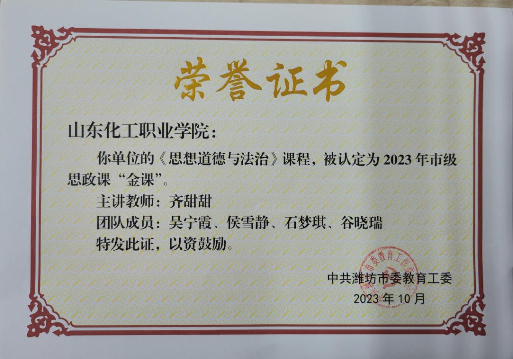 近日,中共潍坊市委教育工委公布了2023 年市级思政课“金课”精品课程名单,我校齐甜甜老师主讲的《思想道德与法治》课程入选市级思政课“金课”。
