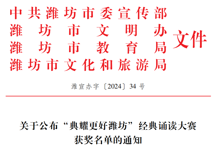 近日,由中共潍坊市委宣传部、潍坊市文明办、教育局、文化和旅游局联合举办的“典耀更好潍坊”经典诵读大赛公布获奖结果,我校基础教学部指导的学生作品《乳娘》喜获一等奖。