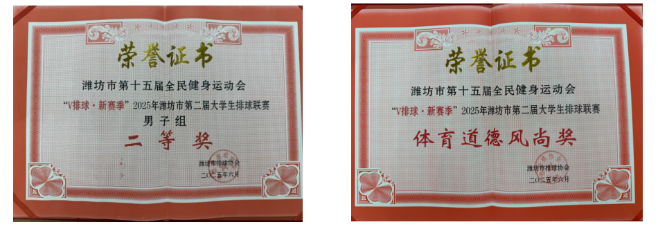 2025年6月8日,由潍坊市体育局、潍坊市教育局等17家部门联合举办的“潍坊市第二届大学生排球联赛”圆满落幕。我校男子排球队凭借出色的团队配合和顽强的拼搏精神,在17支参赛队伍中位列第四,获得本次比赛二等奖,并摘取“体育道德风尚奖”,为学校争得荣誉。