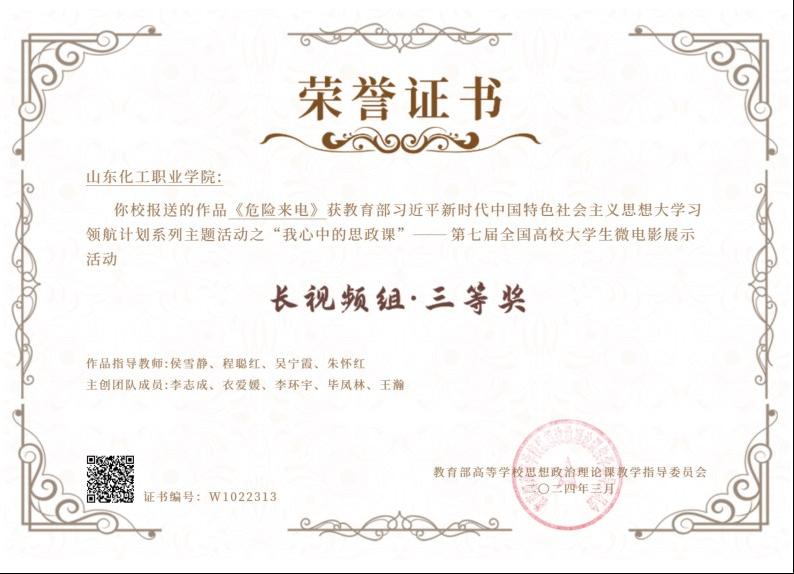 正是有这一腔热血,每一次比赛都有新的进步、新的收获。我指导的《危险来电》获教育部习近平新时代中国特色社会主义思想大学习领航计划系列主题活动之“我心中的思政课”——第七届全国高校大学生微电影展示活动长视频组三等奖。