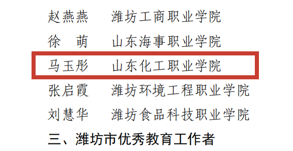近日,潍坊市委教育工委发布了《关于表扬2024年潍坊市教育系统表现突出的集体和个人的通报》,马克思主义学院教师马玉彤荣获“2024年潍坊市优秀教师”。