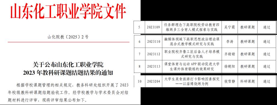 1月7日,学校下发《关于公布山东化工职业学院2023年较快科研课题结题结果的通知》(山化院教〔2025〕2号),我部吴宁霞、李涛、齐甜甜、徐朝阳、侯雪静老师各自主持的课题均通过校内外专家评审,顺利结项。