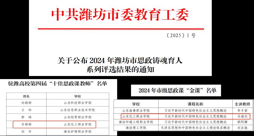 1月23日,中共潍坊市委教育工委下发《关于公布 2024 年潍坊市思政铸魂育人系列评选结果的通知》(〔2025〕1 号),我部齐甜甜老师获评驻潍高校第四届“十佳思政课教师”、马瑞杰老师主讲课程《习近平新时代中国特色社会主义思想概论》获评2024年市级思政课“金课”。