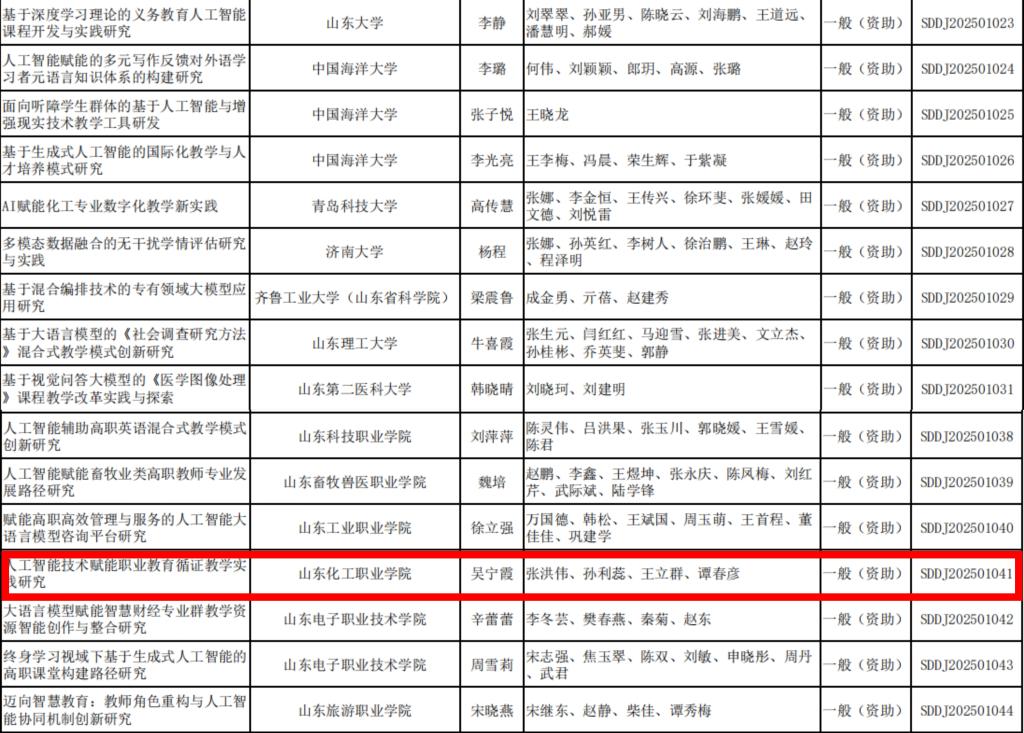 近日,山东省电化教育馆公布了全省人工智能教育研究课题立项名单,我校《人工智能技术赋能职业教育循证教学实践研究》课题从众多高校中脱颖而出成功获批立项并获得资助。该课题由我校基础教学部吴宁霞联合多学科教师组成研究团队,聚焦职业院校人工智能技术赋能循证教学实践的落地路径与创新模式开展研究,标志着我校在人工智能教育领域的探索迈出重要一步。