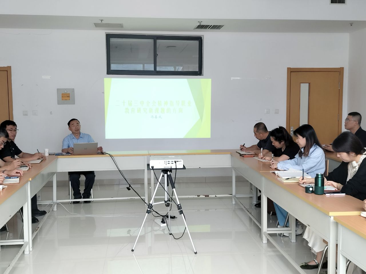 为深入学习宣传贯彻党的二十届三中全会精神,按照学校《关于学习贯彻“党的二十届三中全会精神”实施方案》要求,9月12日上午,学校党委班子成员、常务副校长冯喜成同志到基础教学部党支部、机电工程学院党总支以“二十届三中全会精神指导职业教育研究新课题的方向”主题,向党员们宣讲党的二十届三中全会精神。